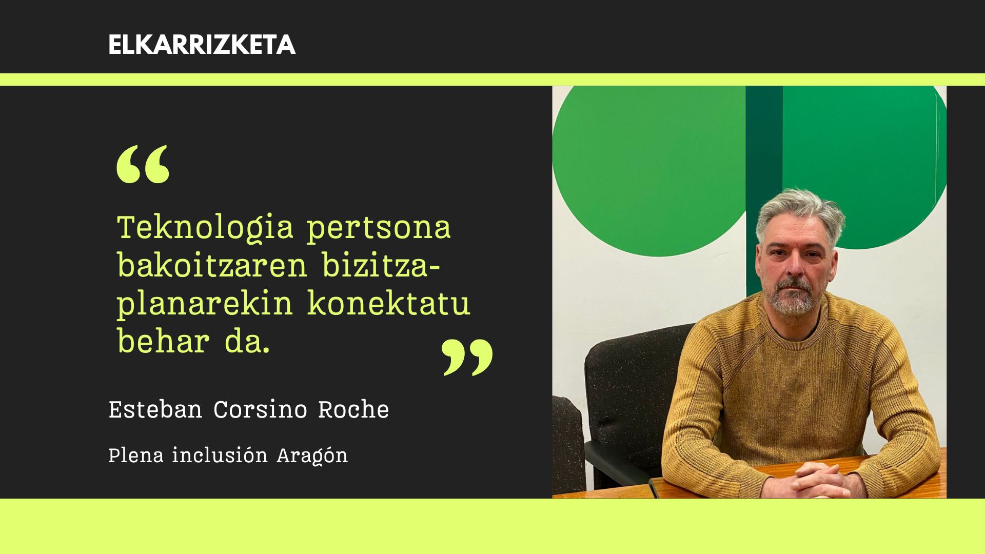 Esteban Corsino, Plena inclusión Aragoneko teknikaria. Elkarrizketa horretan, Corsinok azpimarratu du teknologia adimen- edo garapen-desgaitasuna duen pertsona bakoitzaren bizitza-proiektuaren zerbitzurako beste laguntza bat dela. Mi Casa proiektuan duen esperientziatik abiatuta, laguntza-sisteman txertatzeko eta erakundeetan aldaketa kulturala bultzatzeko beharra defendatzen du,